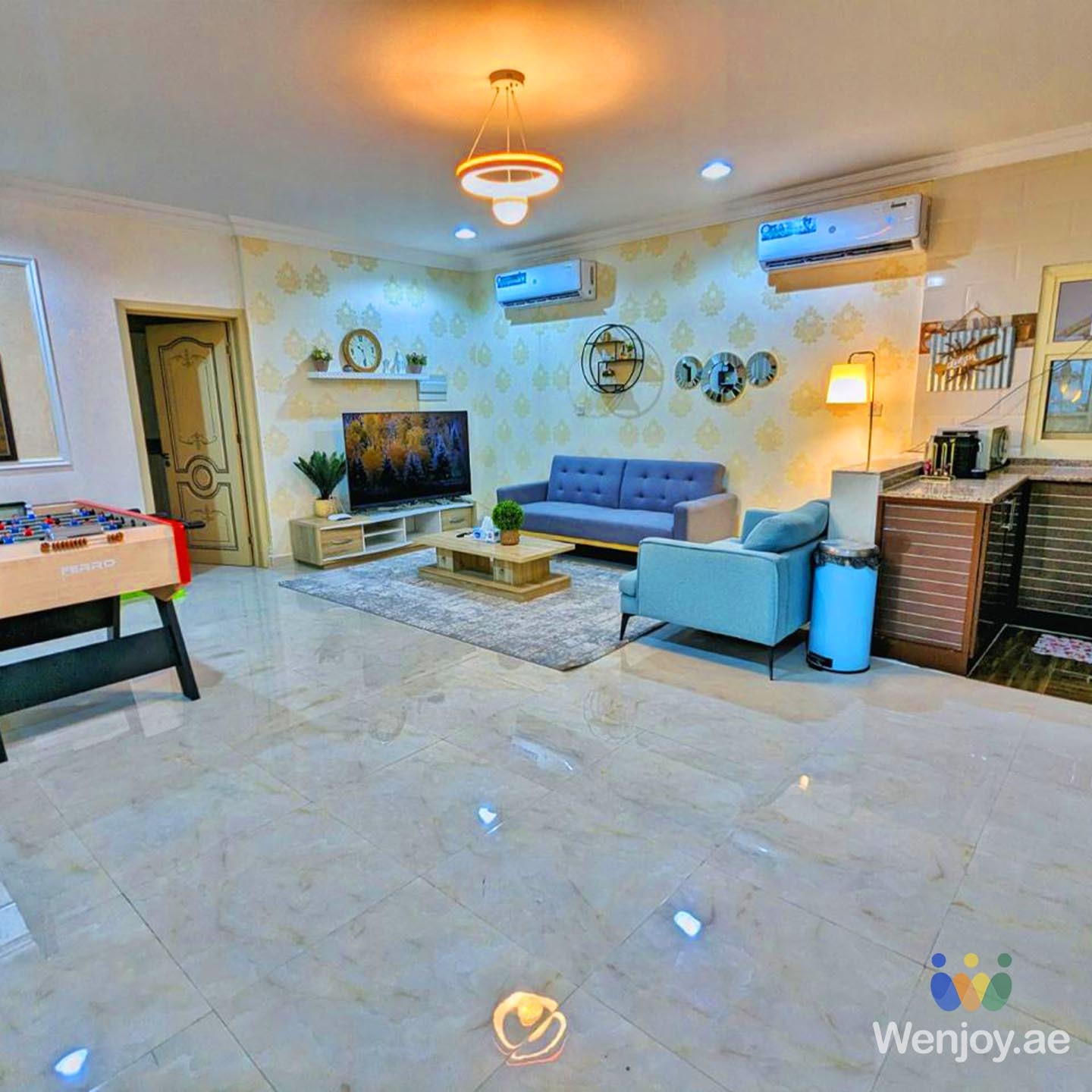 Tucked away in the natural beauty of Al Ain, our farm offers a perfect blend of modern entertainment and peaceful nature. Whether you’re hosting a starlit gathering or enjoying a cozy indoor evening with high-speed WiFi and a Smart TV, every detail is designed for comfort.